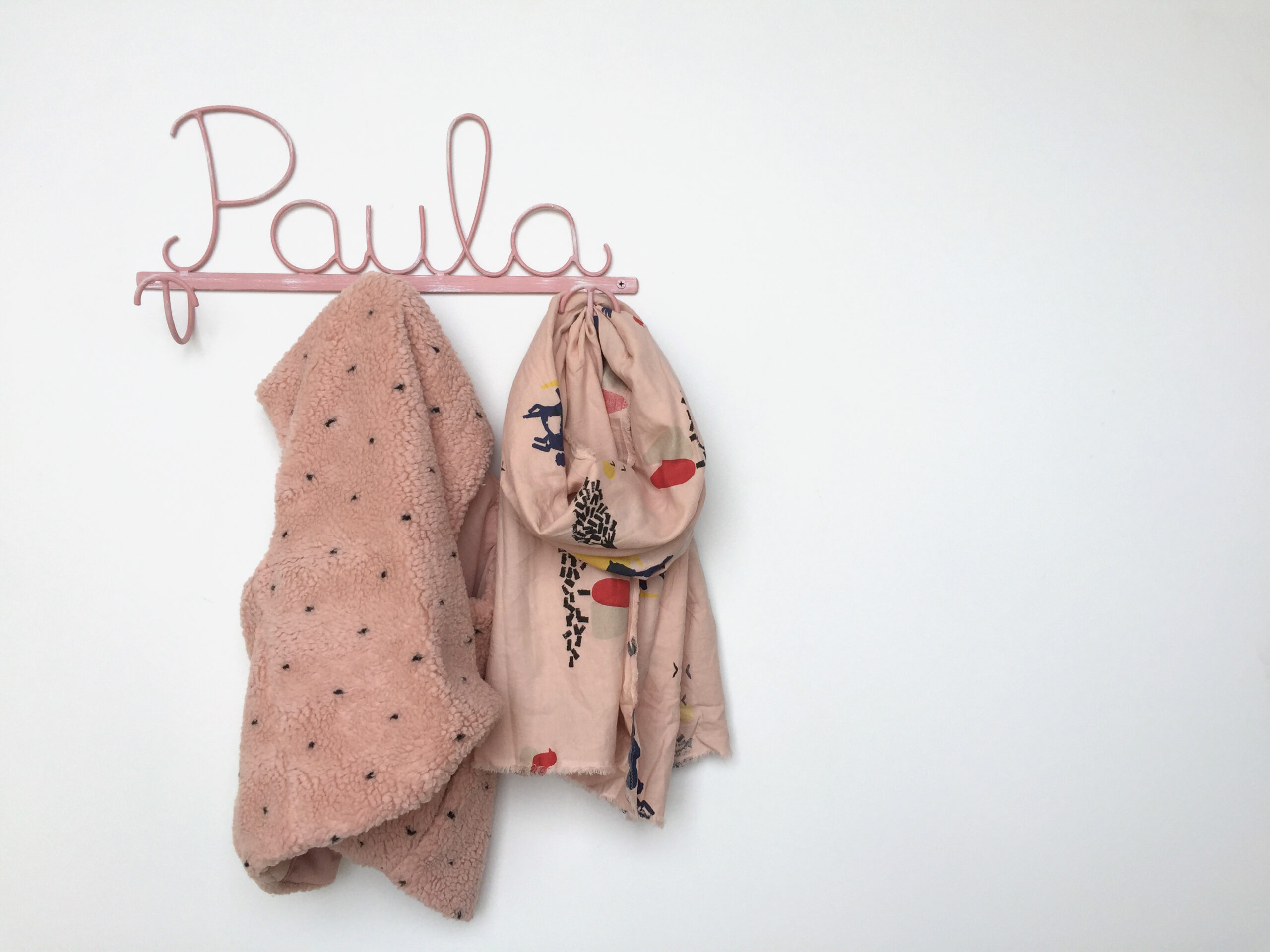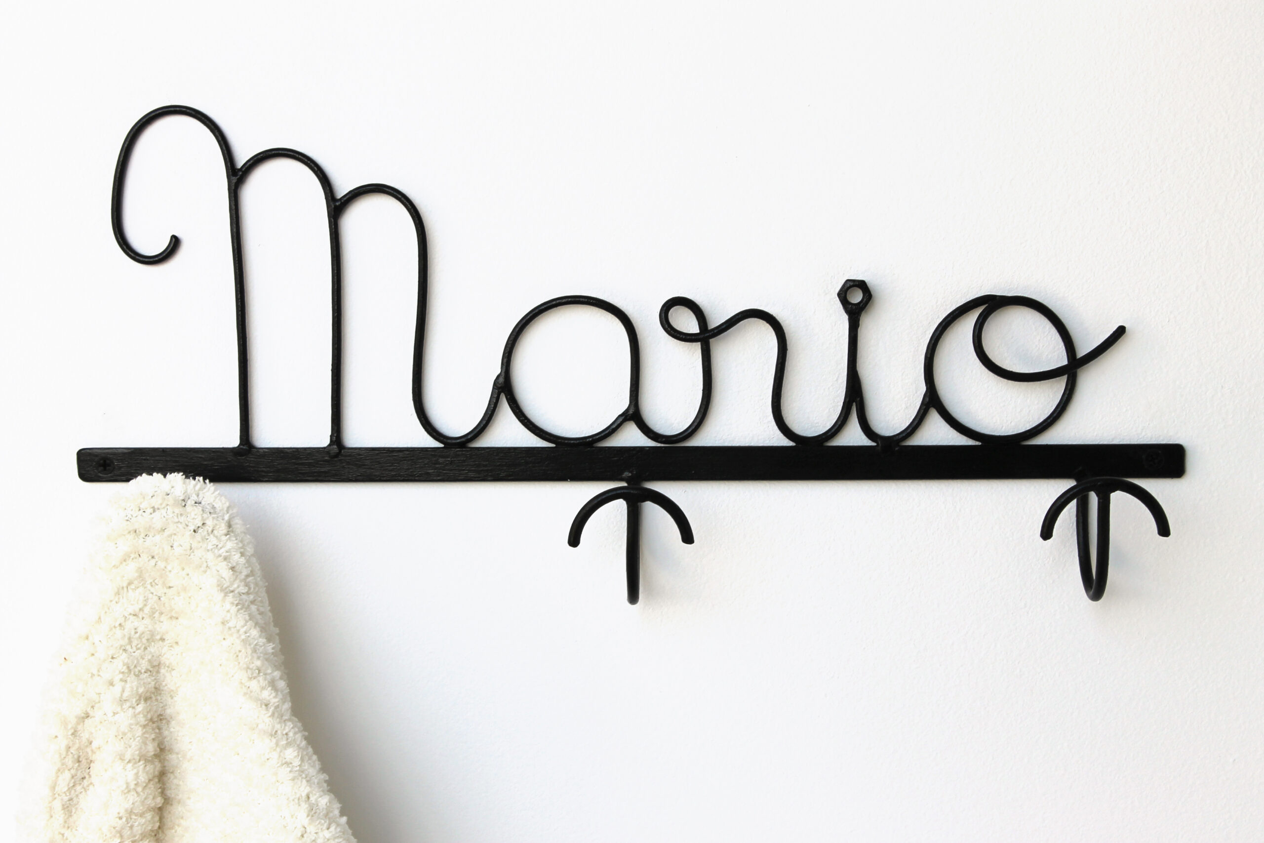 Transformem qualsevol nom o paraula en penjador. Posem dues boles als extrems on pots penjar jaquetes, barrets, tovalloles, mocadors, draps…
