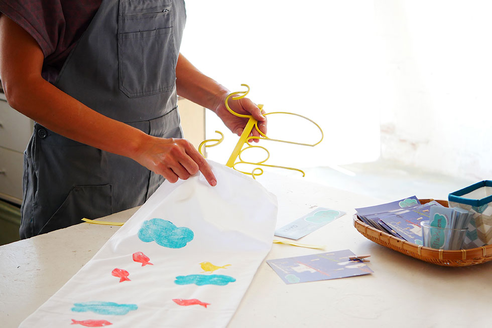 Entreguem els penjadors infantils dins d’una bossa de tela de cotó, cosida i pintada a mà.